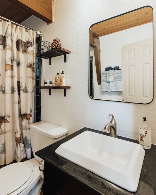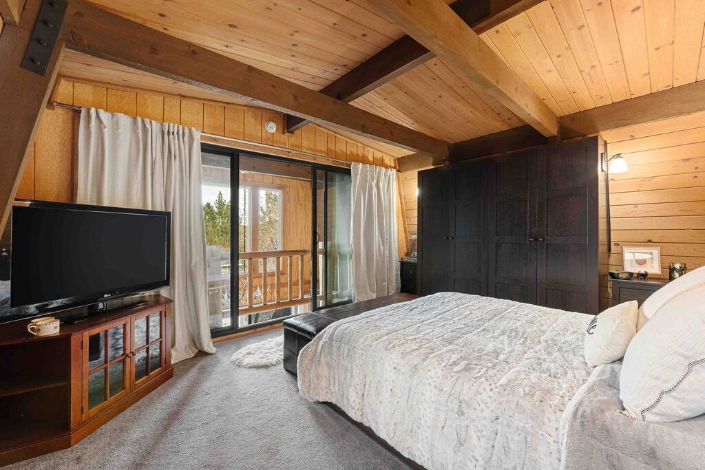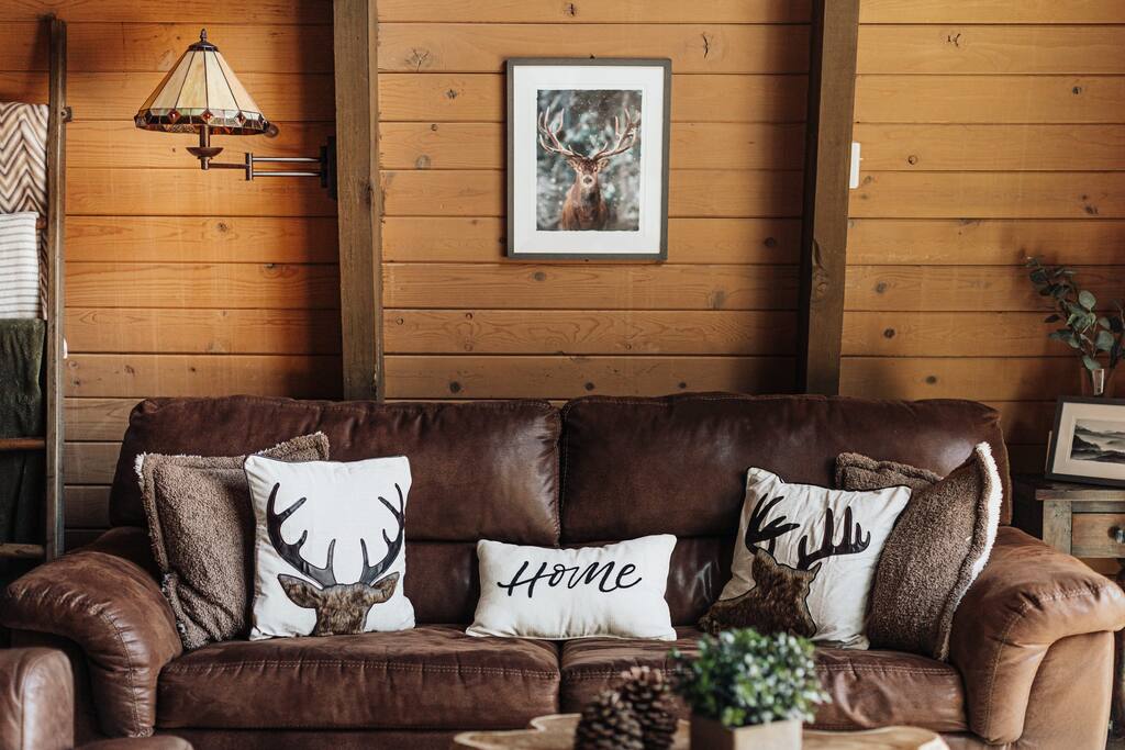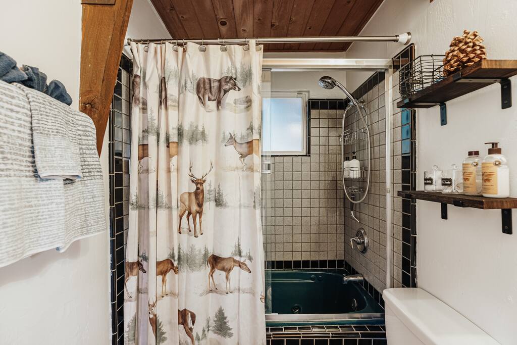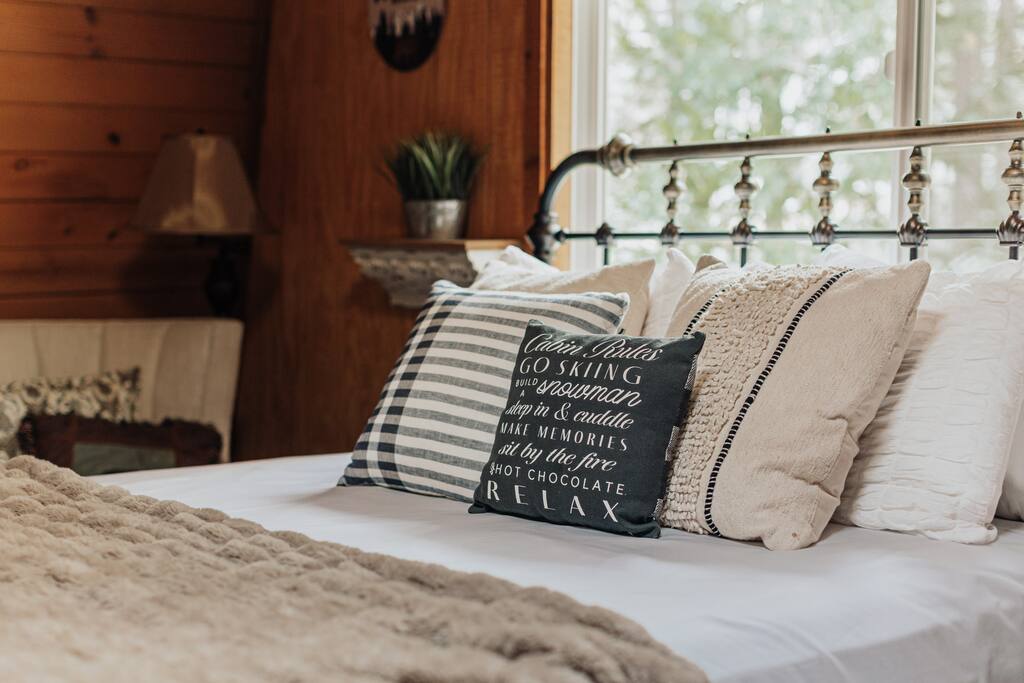 Maximum 6 person occupany only. Elk Run cabin is a stunning Gambrel which is thoughtfully designed to give a modern and rustin charm while maintaining the cozy cabin vibe. A sprawling living area with 65" flat screen smart tv, plush carpet, and wood burning fireplace. The kitchen has stainless steel appliances, a fully equipped coffee and cocoa bar, and plenty of cooking essentials. The sleeping areas include 2 bedrooms with queen sized beds, a sofa, and a pull out couch. Plenty of extra blankets and pillows. There are 2 bathrooms. One standing shower and one with a jetted tub. Brand new tankless water heater has been installed just a year ago. Rest assured, you will never run out of hot water. Fully fenced backyard and wrap around deck. You will find youself in a state of relaxation in our balcony with the most amazing lake and mountain views. Covered parking structure and massive driveway big enough to fit 2 vehicles. **Strictly no side street parking ** Central heating and portable heaters available ** No AC. We encourage you to open the windows and utilize the portable fans provided during the hot summer months Please be aware of San Bernadino's short term rental restrictions before booking. Quiet hours are from 10pm - 8 am. No outdoor bbq and loud music during quiet hours