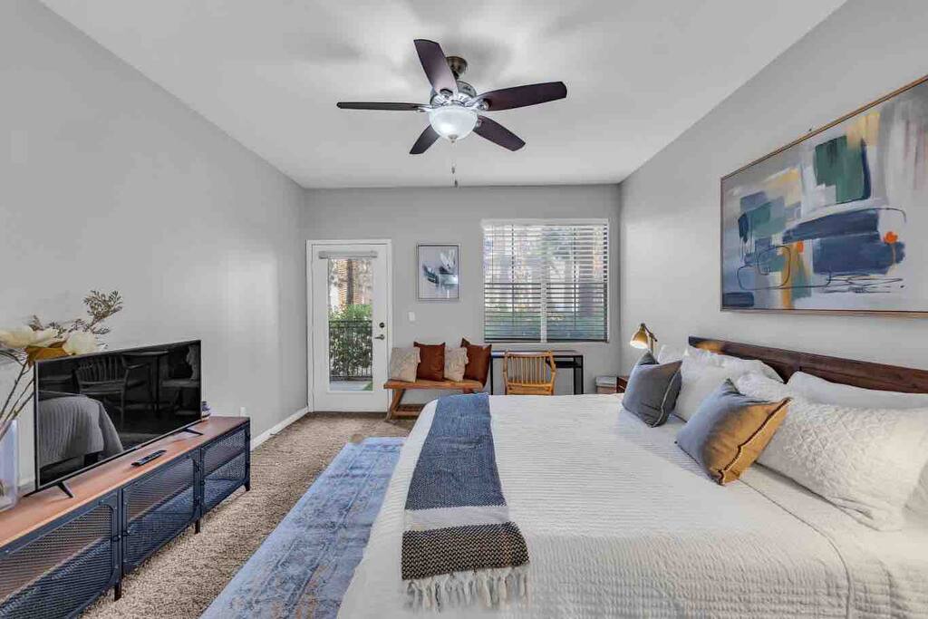 Keyless entry is anytime after 4:00 pm. A door code will be provided to you to access the front door 4 hours prior to check in. It will be activated at exactly 4pm the day of check in. Check out time is no later than 11 am. NO exceptions. - There are 3 beds available for use (king bed in the masters and and a full size bed in the 2nd bedroom, queen size bed in the 3rd bedroom) If you have any requests or concern prior to or during your stay, please contact me directly. Do NOT go to the main office or ask next door tenants. *Undisclosed guests* Please update all guest count in your group staying at our place. There will be a $50 charge per guest/night penalty for any person that stays without approval or that is undisclosed. Quiet hours: 9pm - 8am A note about the Cleaning Fee: The cleaning fee is to prepare the unit for guest visits, launder towels/linens, replenish supplies, make beds, vacuum and clean the bathroom. Please be courteous enough to put the dishes in the dishwasher and take out the trash. This keeps the place sanitary and will allow us to continue charging a minimal cleaning fee for all of our guests. No access to the Pool and fitness center unless you are staying for 60 days or more. You must register with our HOA and sign a lease agreement. Disclaimer: ๐ก๏ธ We lock our thermostat to so if you need to have the temperature adjusted, we can do it for you remotely. If you are not comfortable with this our place is not the right fit for you.