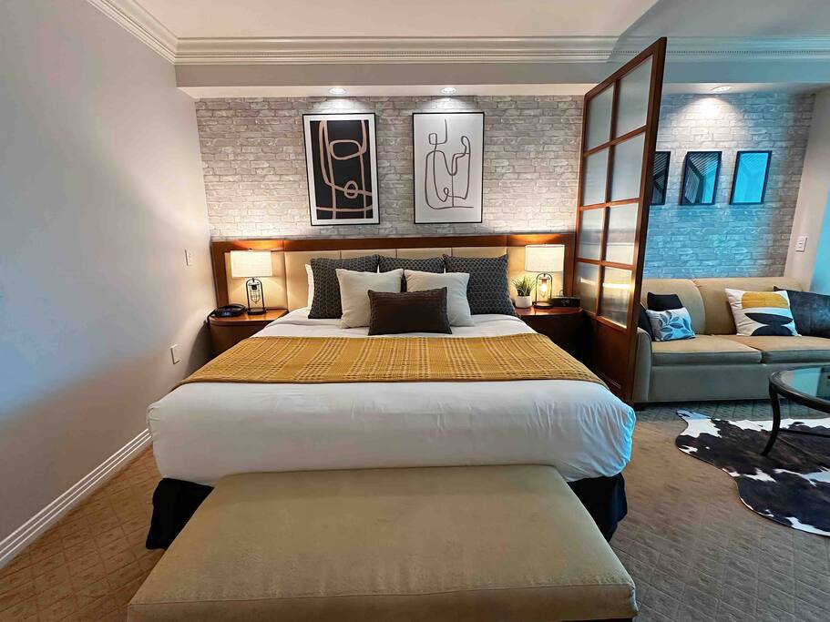 You are booking a unique studio suite that is beautifully furnished that's nothing like any other units within the MGM Signature. It features an edgy design yet still provides pure tranqility of 550 sq footage of living space that showcases heavy influence on contemporary palette with traces of industrial elements. A retreat displaying warmth, comfort and quiet escape. β¨ Amenities include but not limited to: 1 King size bed with a plush luxury mattress 1 Queen size sofa bed in the living room Miele and Bosch fully stocked kitchenette Stainless steel mini fridge and microwave 2 electric burner stovetop Dining table Keurig coffee maker Coffee k-cups and hot tea Dinnerware and utensils Digital safe Comfortable accent chair Workspace/Dining area seating for 2 Iron and Ironing board. Ultra-thin LCD flat-screen, high-definition TV High-speed Internet access with wireless capabilities. The bathroom features dual sinks, a walk in shower and oversized Jacuzzi-brand whirlpool tub. β₯οΈ Book with confidence! Licensed and inspected vacation rental.