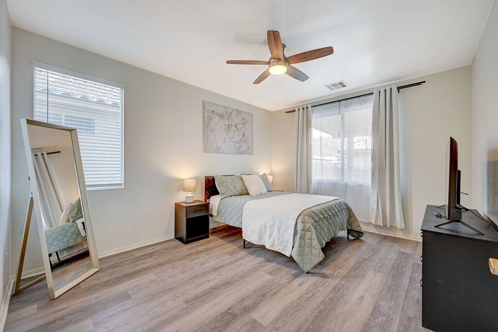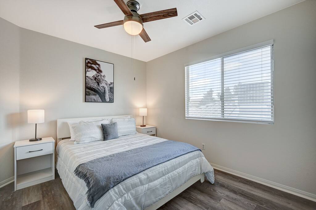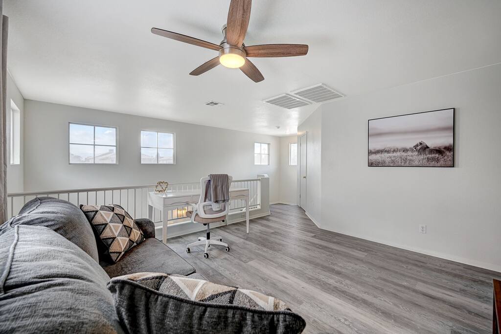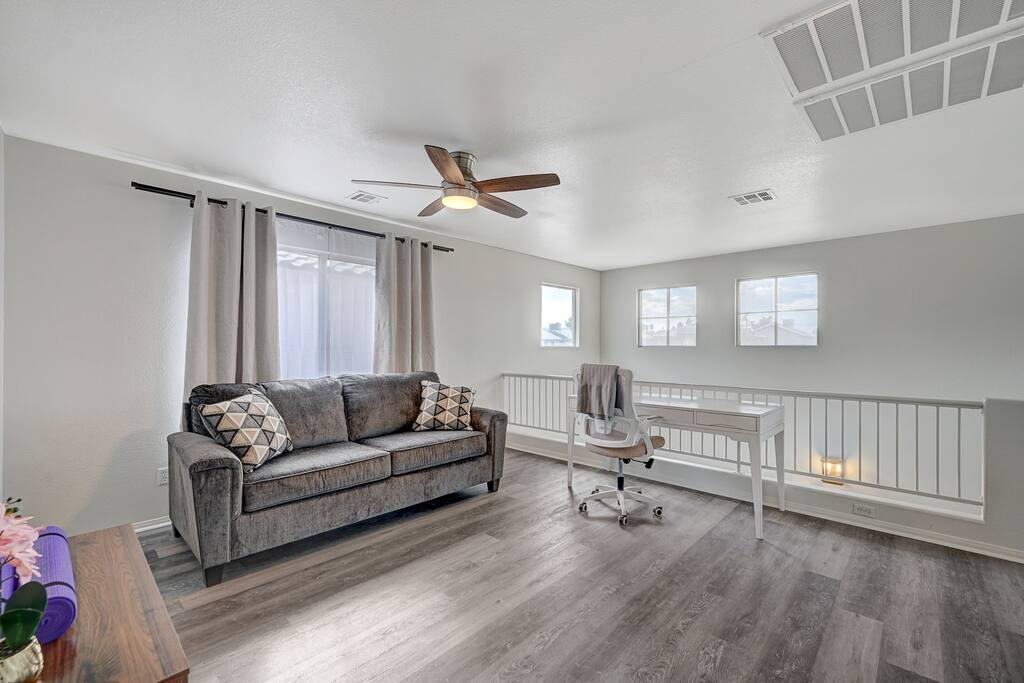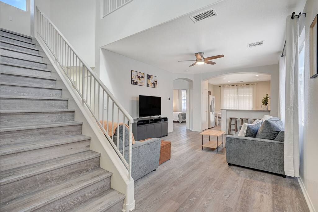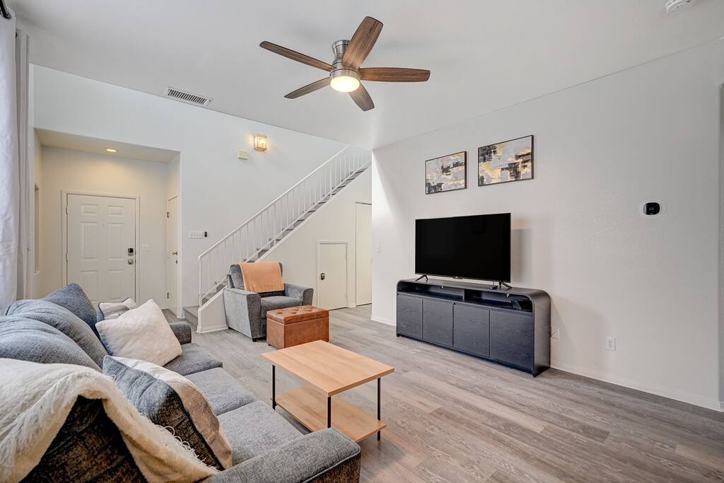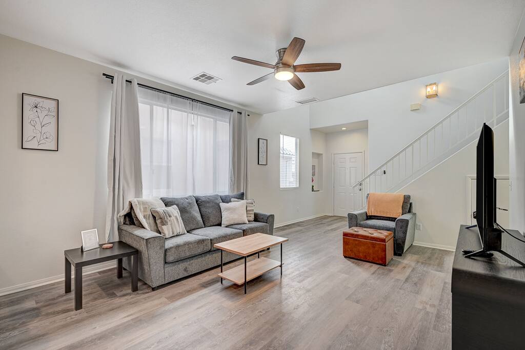 Enjoy a comfortable stay in this beautiful two-story home featuring: 🔹🛏️ 2 bedrooms upstairs + versatile loft with sofa bed 🔹🛌 1 bedroom downstairs with connected bathroom 🔹🚿 2.5 bathrooms 🔹🏡 Spacious living room for relaxation 🔹🍽️ Fully equipped kitchen with stainless steel appliances and basic kitchen essentials 🔹Counter bar seating with 3 bar stools 🔹🚗 Oversized driveway with ample parking 🔹🌿 Covered patio and backyard space for outdoor enjoyment ♥️ Perfect for families, groups, or business travelers looking for a cozy and convenient stay! Conveniently near the Las Vegas strip, grocery stores, and restaurants.