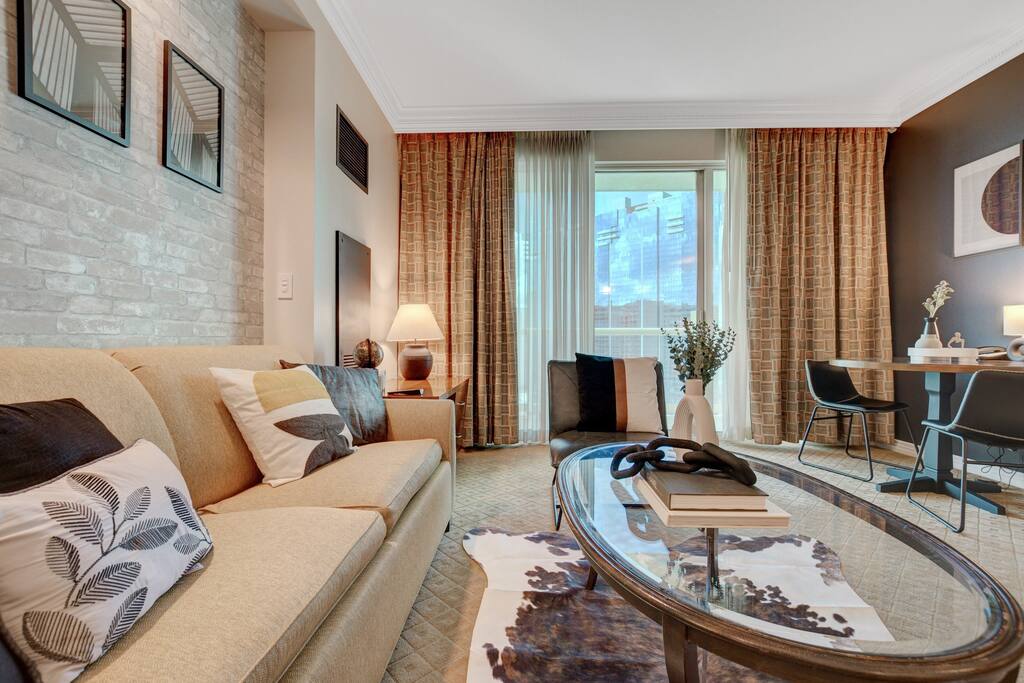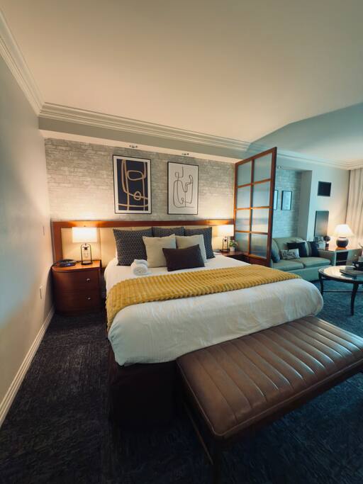 You are booking a unique studio suite that is beautifully furnished that's nothing like any other units within the MGM Signature. It features an edgy design yet still provides pure tranqility of 550 sq footage of living space that showcases heavy influence on contemporary palette with traces of industrial elements. A retreat displaying warmth, comfort and quiet escape. ☁️💞Amenities include but not limited to: 1 King size bed with a plush luxury mattress 1 Queen size sofa bed in the living room Miele and Bosch fully stocked kitchenette Stainless steel mini fridge and microwave 2 electric burner stovetop Dining table Keurig coffee maker Coffee k-cups and hot tea Dinnerware and utensils Digital safe Comfortable accent chair Workspace/Dining area seating for 2 Iron and Ironing board. Ultra-thin LCD flat-screen, high-definition TV High-speed Internet access with wireless capabilities. The bathroom features dual sinks, a walk in shower and oversized Jacuzzi-brand whirlpool tub. 💫 Book with confidence!