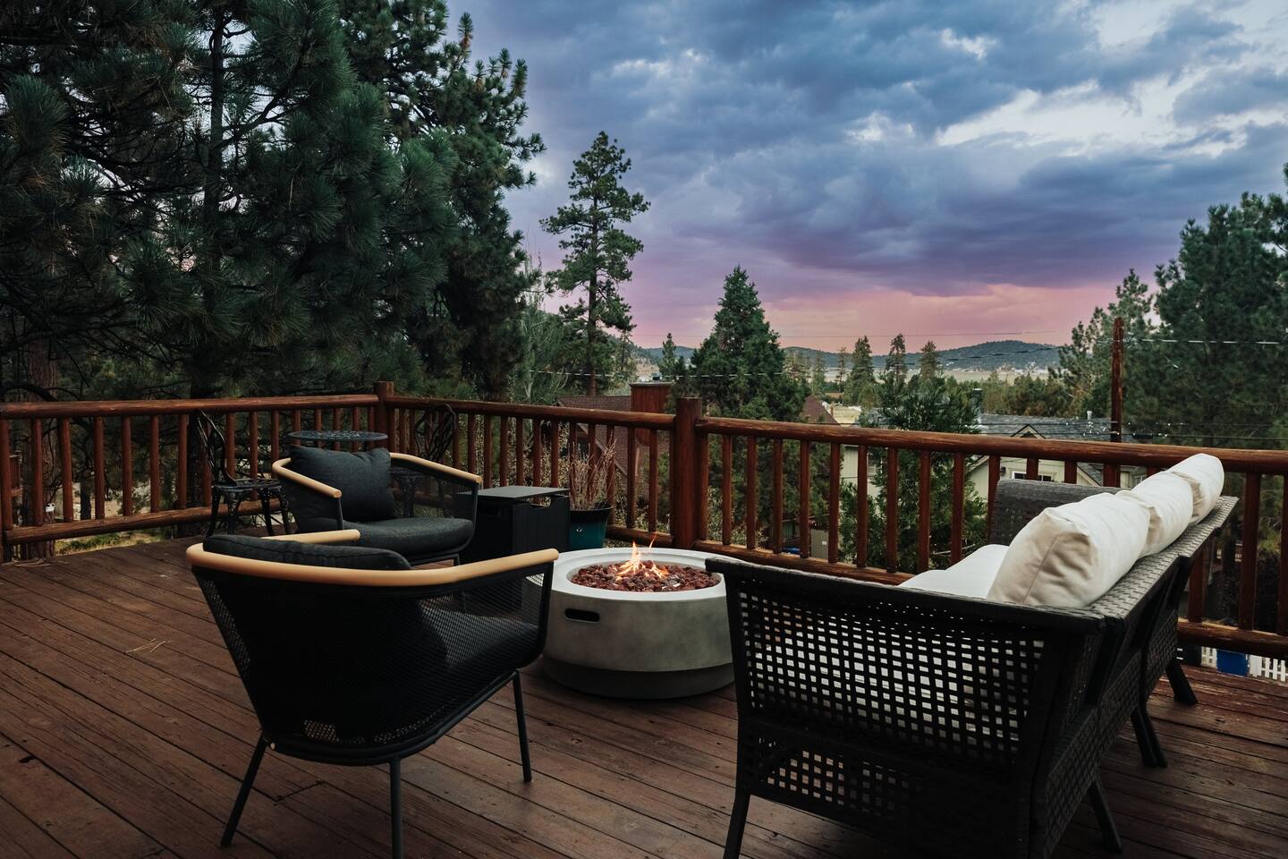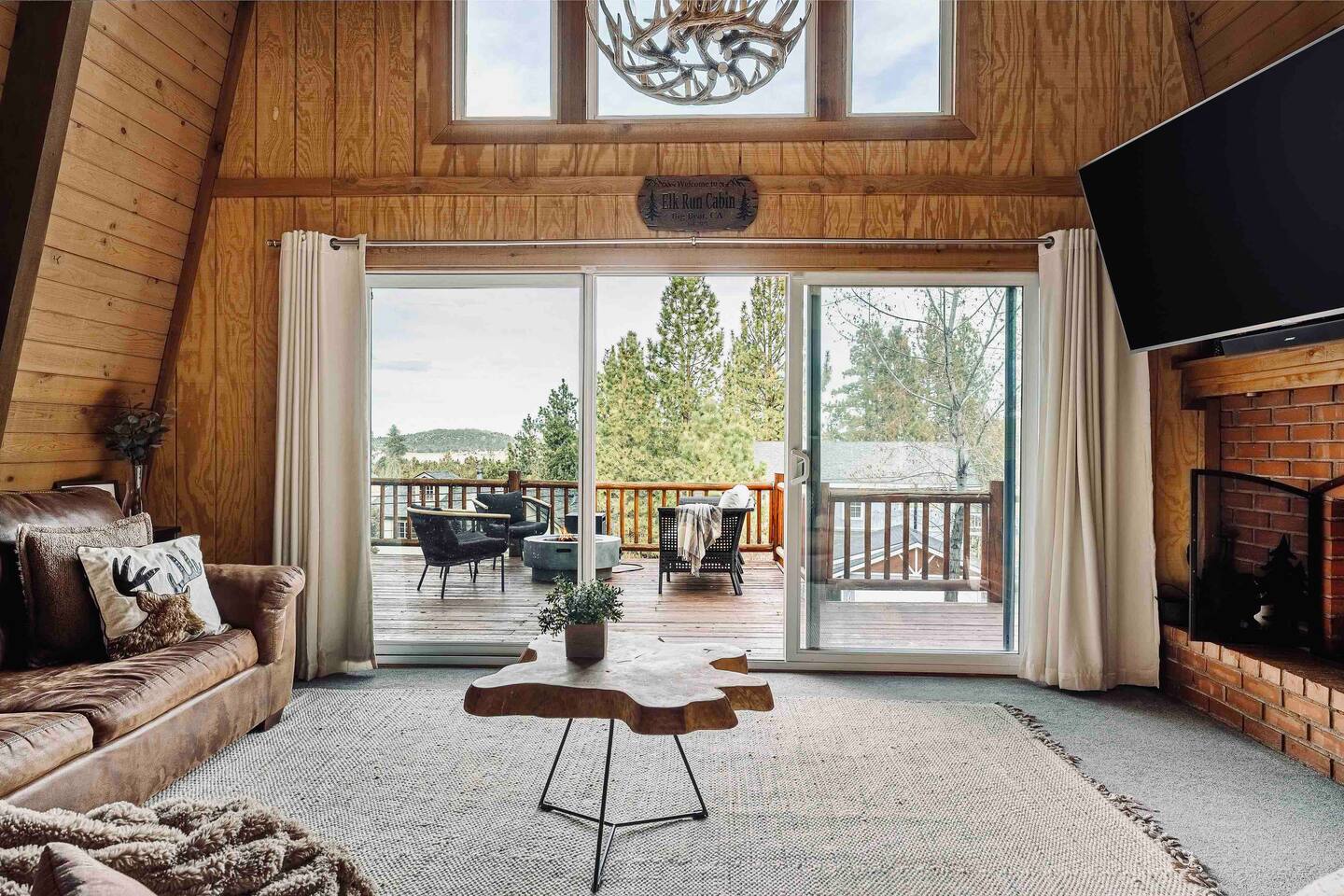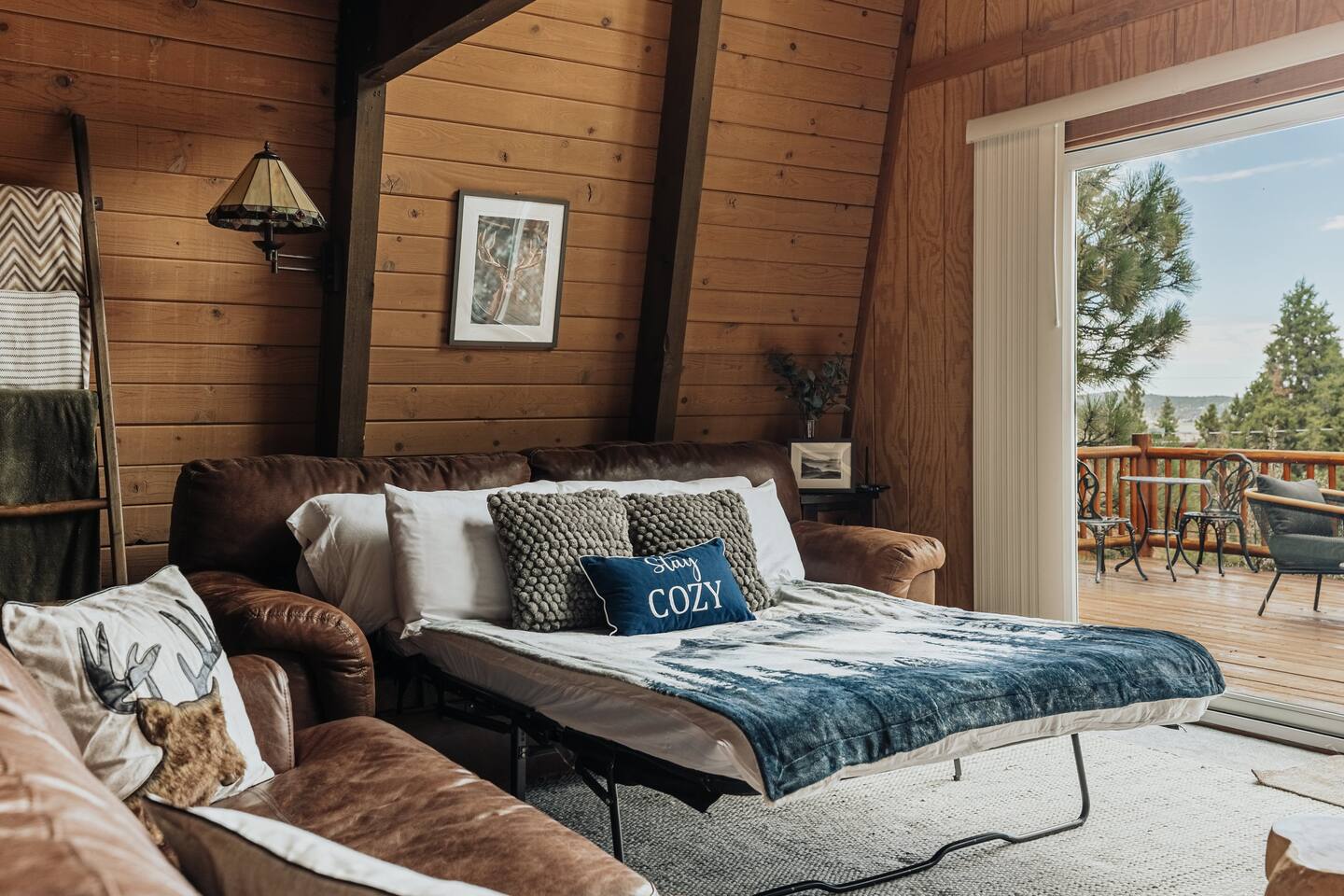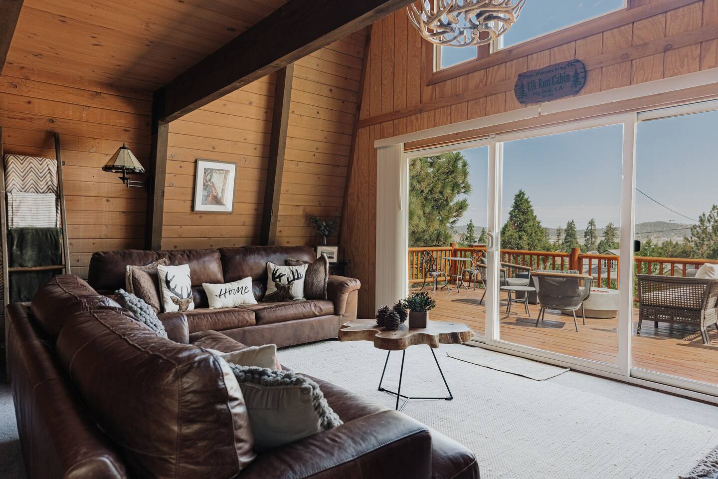 Maximum 6 person occupany only. Elk Run cabin is a stunning Gambrel which is thoughtfully designed to give a modern and rustin charm while maintaining the cozy cabin vibe. A sprawling living area with 65" flat screen smart tv, plush carpet, and wood burning fireplace. The kitchen has stainless steel appliances, a fully equipped coffee and cocoa bar, and plenty of cooking essentials. The sleeping areas include 2 bedrooms with queen sized beds, a sofa, and a pull out couch. Plenty of extra blankets and pillows. There are 2 bathrooms. One standing shower and one with a jetted tub. Brand new tankless water heater has been installed just a year ago. Rest assured, you will never run out of hot water. Fully fenced backyard and wrap around deck. You will find youself in a state of relaxation in our balcony with the most amazing lake and mountain views. Covered parking structure and massive driveway big enough to fit 2 vehicles. **Strictly no side street parking ** Central heating and portable heaters available ** No AC. We encourage you to open the windows and utilize the portable fans provided during the hot summer months Please be aware of San Bernadino's short term rental restrictions before booking. Quiet hours are from 10pm - 8 am. No outdoor bbq and loud music during quiet hours