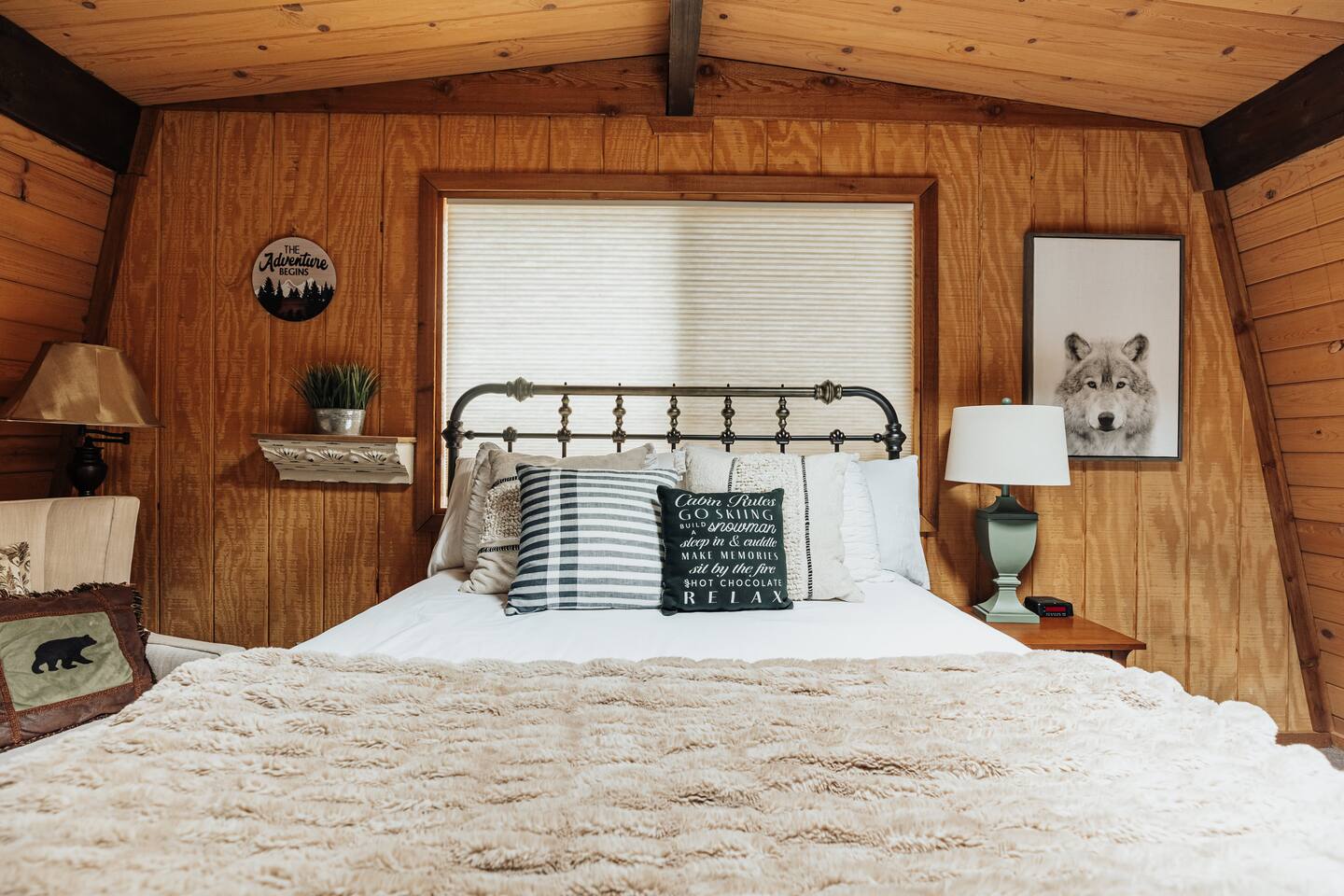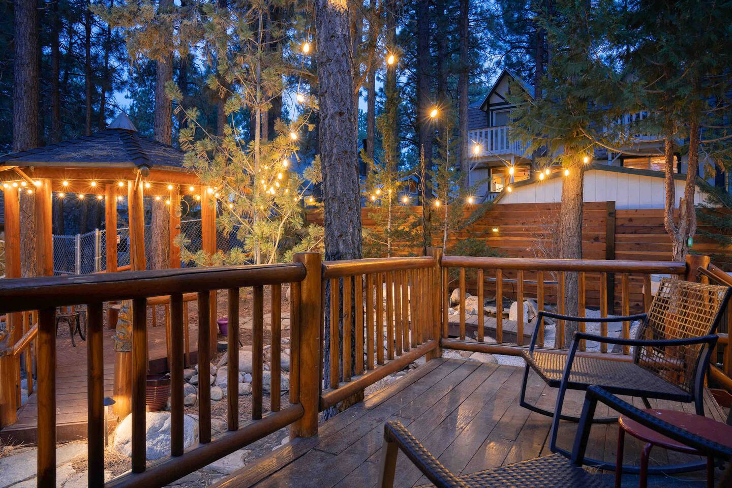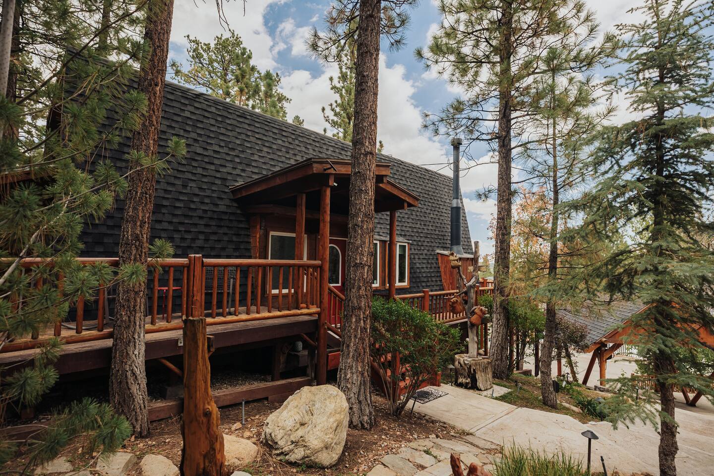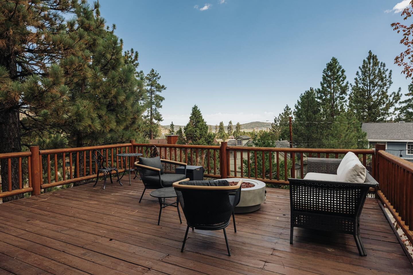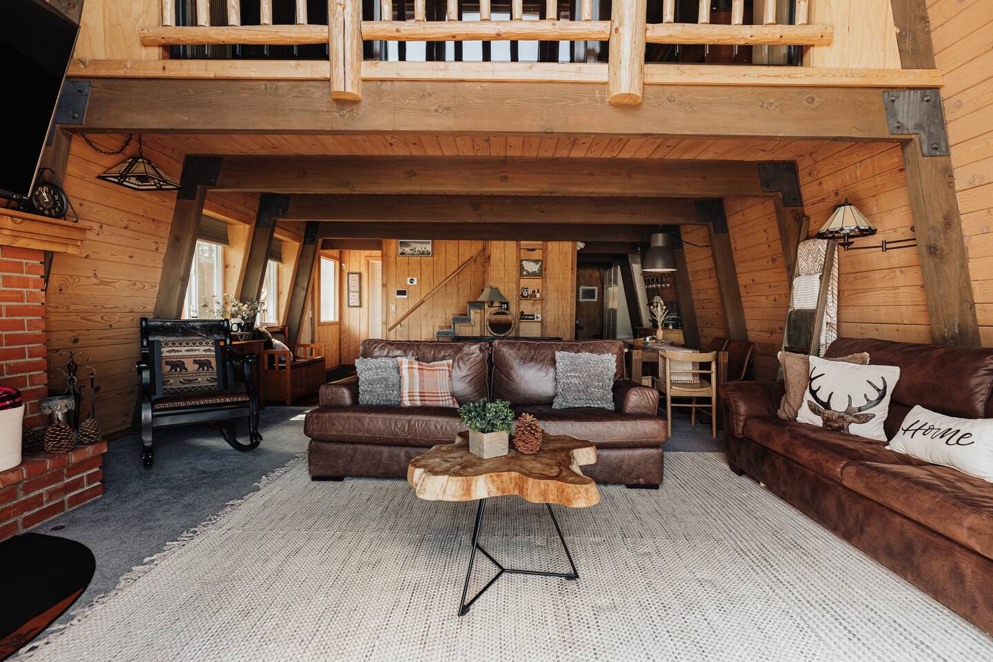 Maximum 6 person occupany only. Elk Run cabin is a stunning Gambrel which is thoughtfully designed to give a modern and rustin charm while maintaining the cozy cabin vibe. A sprawling living area with 65" flat screen smart tv, plush carpet, and wood burning fireplace. The kitchen has stainless steel appliances, a fully equipped coffee and cocoa bar, and plenty of cooking essentials. The sleeping areas include 2 bedrooms with queen sized beds, a sofa, and a pull out couch. Plenty of extra blankets and pillows. There are 2 bathrooms. One standing shower and one with a jetted tub. Brand new tankless water heater has been installed just a year ago. Rest assured, you will never run out of hot water. Fully fenced backyard and wrap around deck. You will find youself in a state of relaxation in our balcony with the most amazing lake and mountain views. Covered parking structure and massive driveway big enough to fit 2 vehicles. **Strictly no side street parking ** Central heating and portable heaters available ** No AC. We encourage you to open the windows and utilize the portable fans provided during the hot summer months Please be aware of San Bernadino's short term rental restrictions before booking. Quiet hours are from 10pm - 8 am. No outdoor bbq and loud music during quiet hours