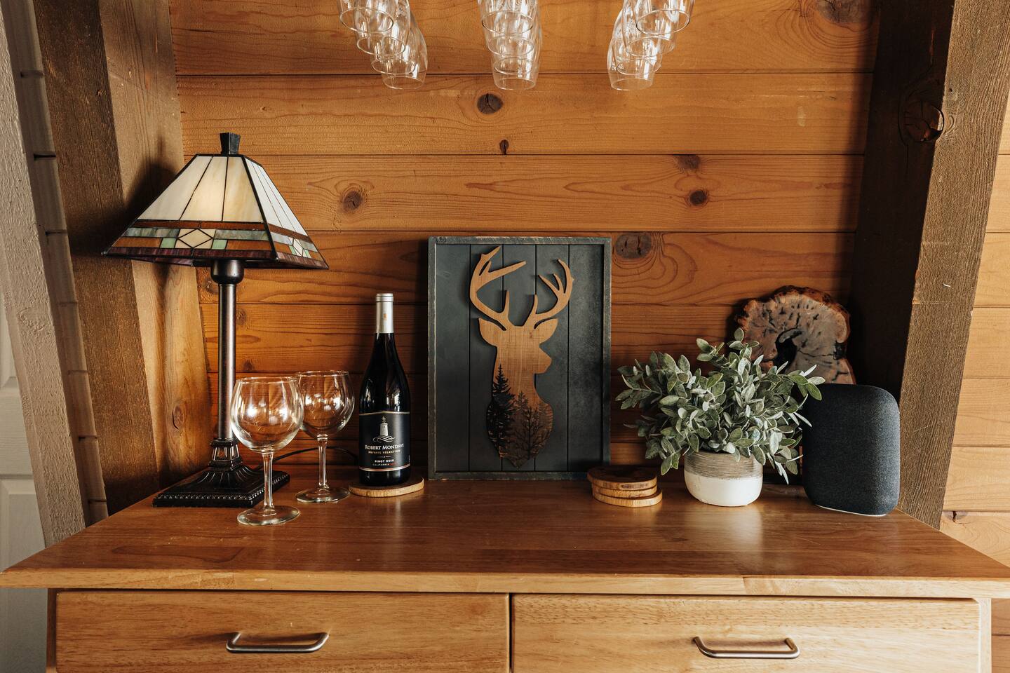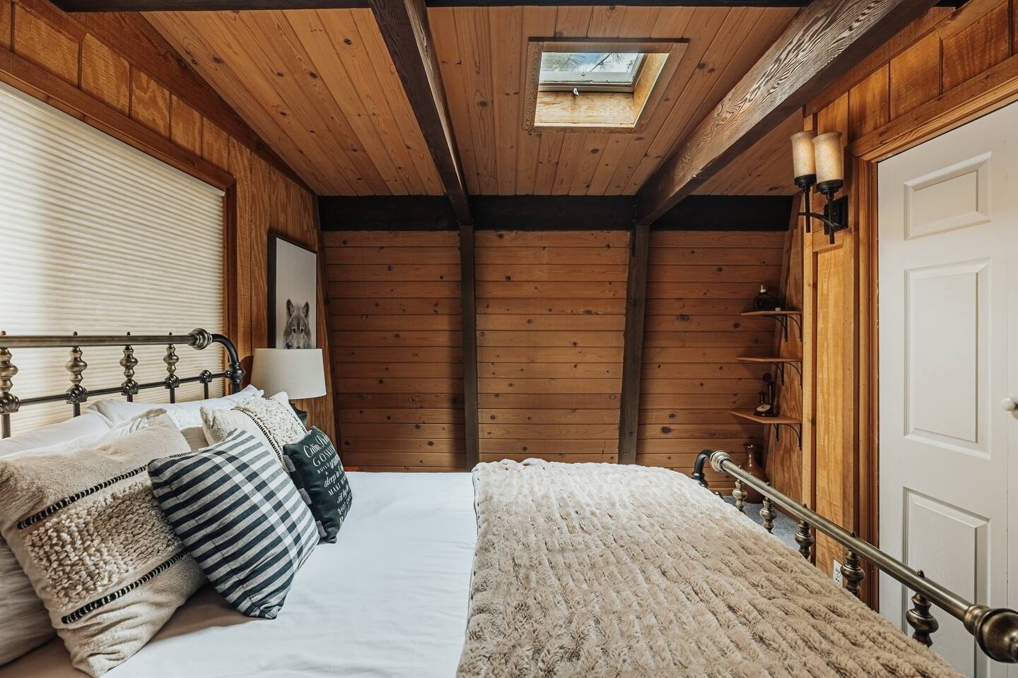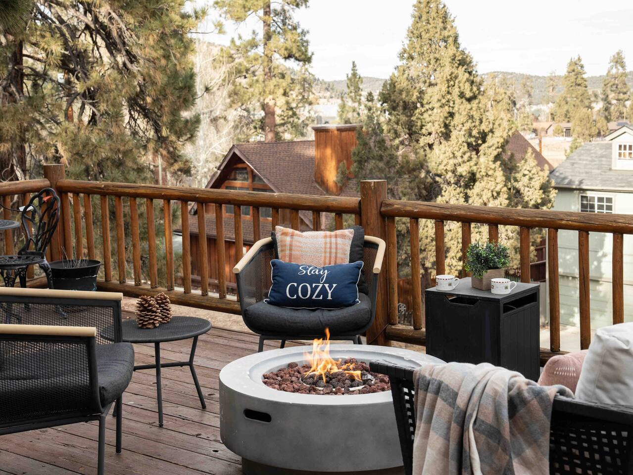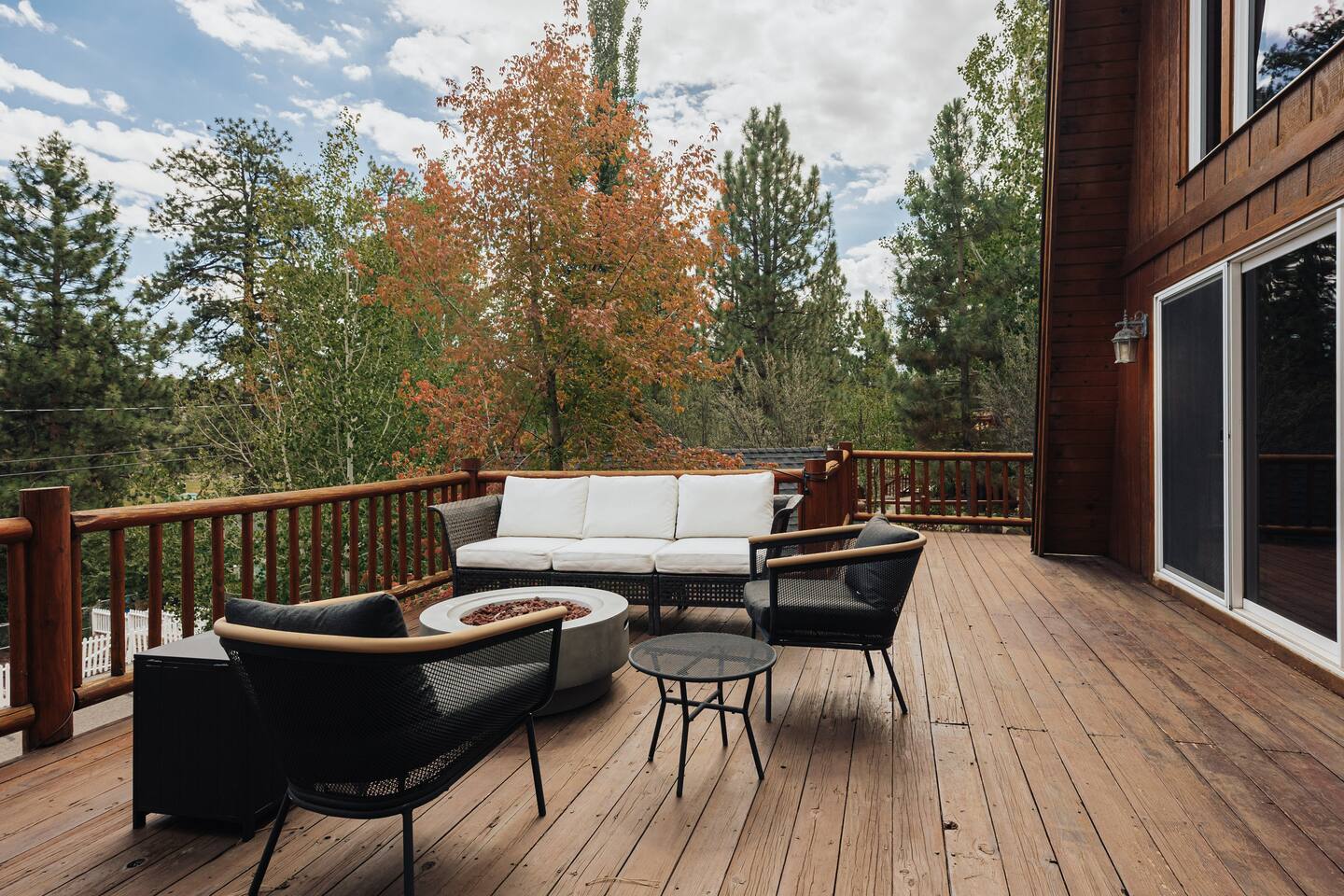 Maximum 6 person occupany only. Elk Run cabin is a stunning Gambrel which is thoughtfully designed to give a modern and rustin charm while maintaining the cozy cabin vibe. A sprawling living area with 65" flat screen smart tv, plush carpet, and wood burning fireplace. The kitchen has stainless steel appliances, a fully equipped coffee and cocoa bar, and plenty of cooking essentials. The sleeping areas include 2 bedrooms with queen sized beds, a sofa, and a pull out couch. Plenty of extra blankets and pillows. There are 2 bathrooms. One standing shower and one with a jetted tub. Brand new tankless water heater has been installed just a year ago. Rest assured, you will never run out of hot water. Fully fenced backyard and wrap around deck. You will find youself in a state of relaxation in our balcony with the most amazing lake and mountain views. Covered parking structure and massive driveway big enough to fit 2 vehicles. **Strictly no side street parking ** Central heating and portable heaters available ** No AC. We encourage you to open the windows and utilize the portable fans provided during the hot summer months Please be aware of San Bernadino's short term rental restrictions before booking. Quiet hours are from 10pm - 8 am. No outdoor bbq and loud music during quiet hours