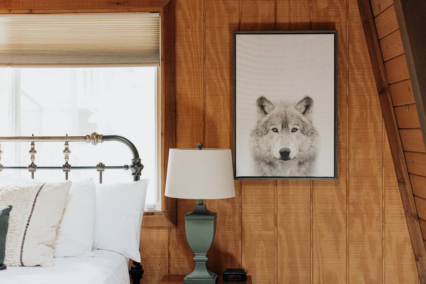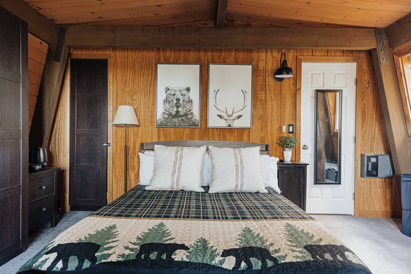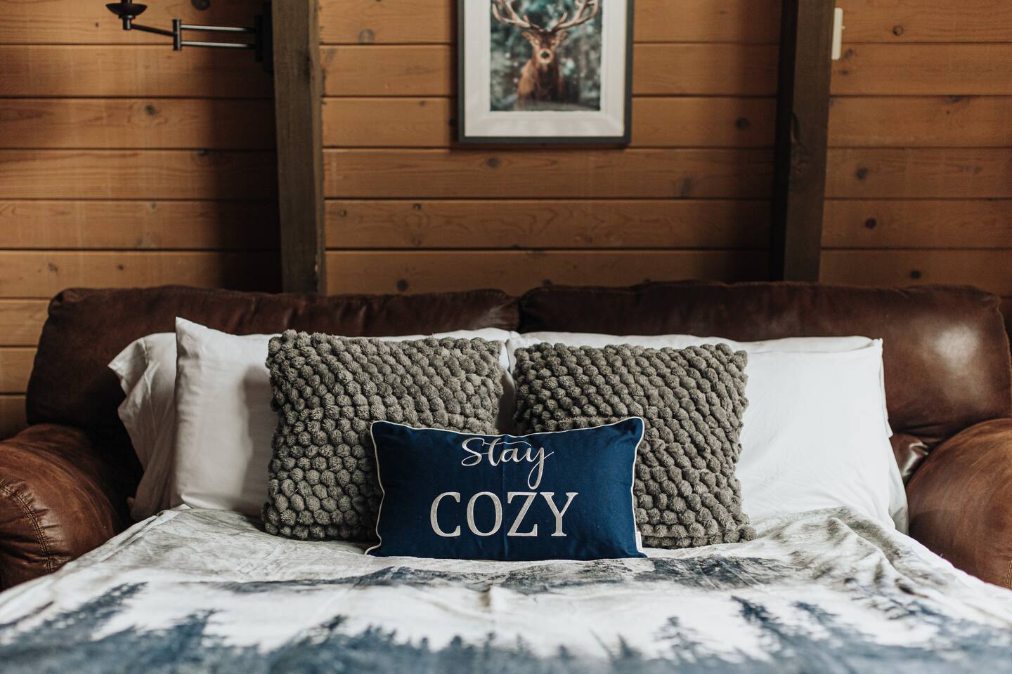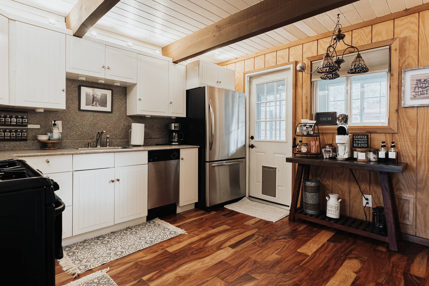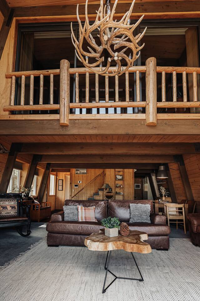 Maximum 6 person occupany only. Elk Run cabin is a stunning Gambrel which is thoughtfully designed to give a modern and rustin charm while maintaining the cozy cabin vibe. A sprawling living area with 65" flat screen smart tv, plush carpet, and wood burning fireplace. The kitchen has stainless steel appliances, a fully equipped coffee and cocoa bar, and plenty of cooking essentials. The sleeping areas include 2 bedrooms with queen sized beds, a sofa, and a pull out couch. Plenty of extra blankets and pillows. There are 2 bathrooms. One standing shower and one with a jetted tub. Brand new tankless water heater has been installed just a year ago. Rest assured, you will never run out of hot water. Fully fenced backyard and wrap around deck. You will find youself in a state of relaxation in our balcony with the most amazing lake and mountain views. Covered parking structure and massive driveway big enough to fit 2 vehicles. **Strictly no side street parking ** Central heating and portable heaters available ** No AC. We encourage you to open the windows and utilize the portable fans provided during the hot summer months Please be aware of San Bernadino's short term rental restrictions before booking. Quiet hours are from 10pm - 8 am. No outdoor bbq and loud music during quiet hours