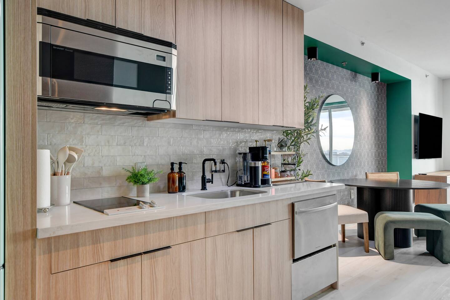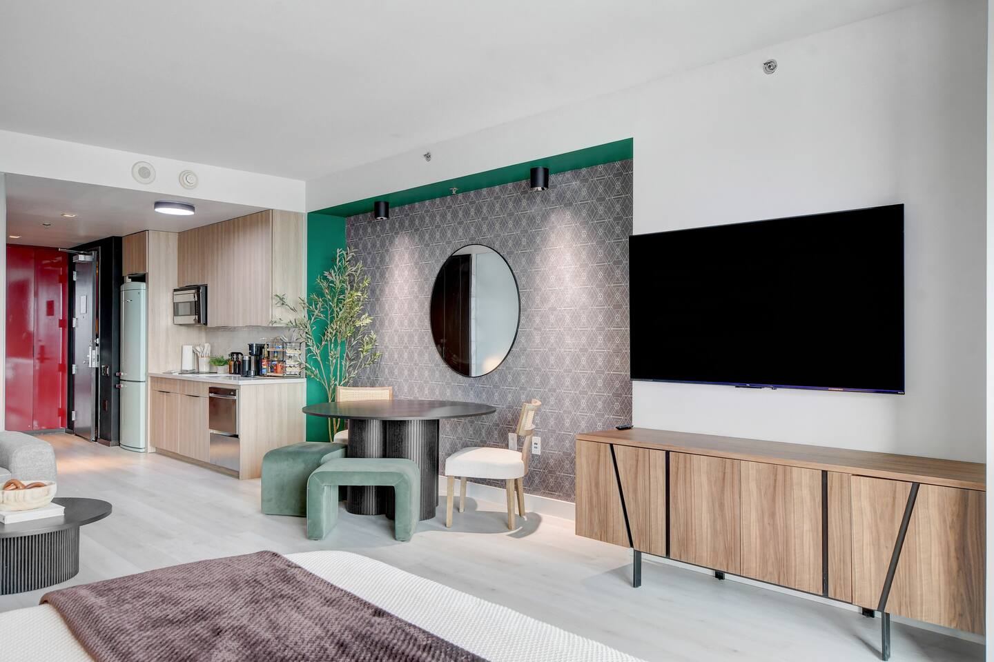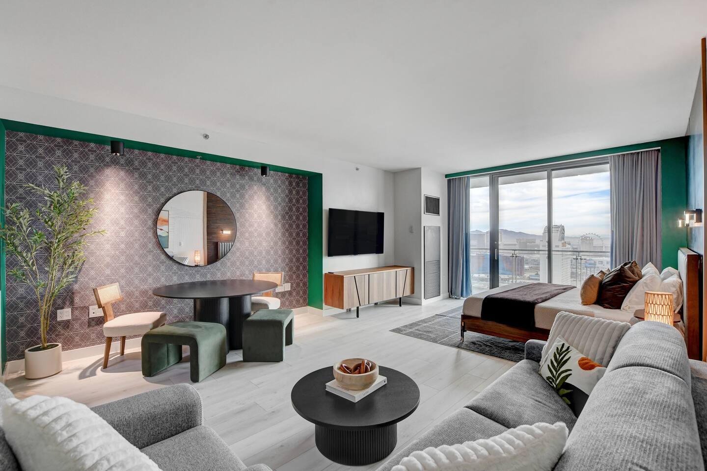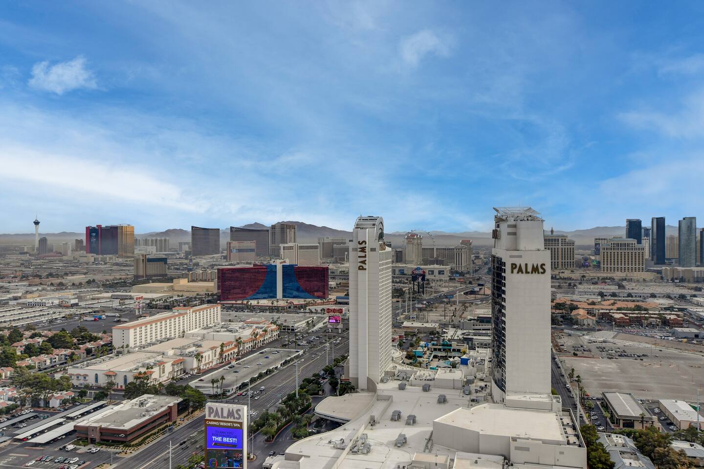✨Welcome to our privately owned timeless and stunning FULLY remodeled 615 sq foot high-rise condo at Palms Place. Enjoy stunning panoramic views of the iconic Strip and mountain views from your private balcony. Immerse yourself in modern comfort with brand new sleek furnishings, a fully equipped kitchenette, designated dining area, and access to exclusive building amenities. Whether you're here for the nightlife or a relaxing getaway, this stylish oasis is your perfect retreat at the Palms Place hotel resort. Inside, you'll find a well-appointed kitchenette, perfect for whipping up a quick meal or snack. The shower and indulgent jetted tub provide a spa-like experience, allowing you to unwind and relax after a day of exploring. You'll have easy access to world-class entertainment, dining, and shopping options. Whether you're here for a weekend getaway or an extended stay, this condo offers a comfortable retreat in the midst of all the excitement. ✅ Amenities include but not limited to: Bedroom area: 🔹King size bed with a plush memory foam 🔹luxury mattress with 2 nightstands 🔹65" flat screen smart tv with streaming capabilities 🔹Dresser 🔹Area rug Living area: 🔹Queen size sofa bed in the living room Coffee table 🔹2 end tables with lamps 🔹Comfortable accent chair Kitchen: 🔹Fully stocked kitchenette 🔹Retro full size refrigerator with bottle holder and chiller 🔹Stainless steel dishwasher and microwave 🔹Toaster 🔹2 electric burner stovetop 🔹Blender 🔹Keurig coffee maker 🔹Variety K-cups and hot tea 🔹Dinnerware and utensils 🔹Pots and pans 🔹Cutting board Dining area: 🔹55" dining table 🔹2 dining chairs 🔹2 ottomans 🔹Coffee table Bathroom: 🔹Separate shower 🔹Full size bathtub 🔶Other: Digital safe Iron and Ironing board. High-speed Internet access with wireless capabilities. 📣 Per Palms Place policy, there are only four guests maximum in the studio suite. Strictly no pets allowed.