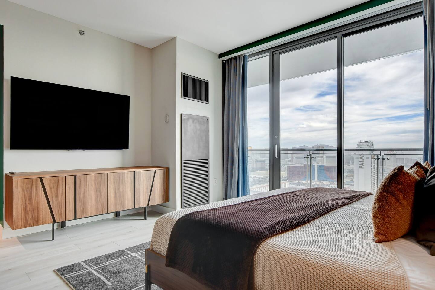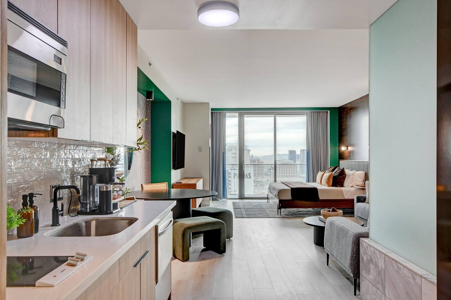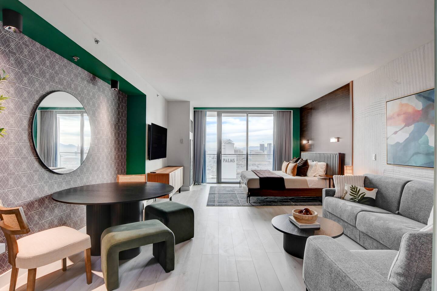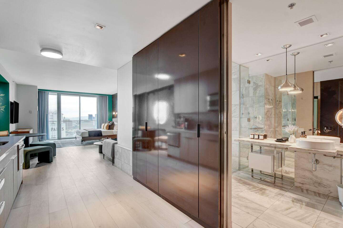 The Ava suite is a thoughtfully designed studio suite nestled on the 37th floor offering a calming zen-like experience with soothing color palette and soft glow ambient lighting. Our place promises a peaceful retreat while allowing you to soak in the lively Las Vegas scene. A perfect blend of relaxation and convenience at Palms Place awaits. Full access to the balcony showcasing breathtaking panoramic Las Vegas strip and city views.