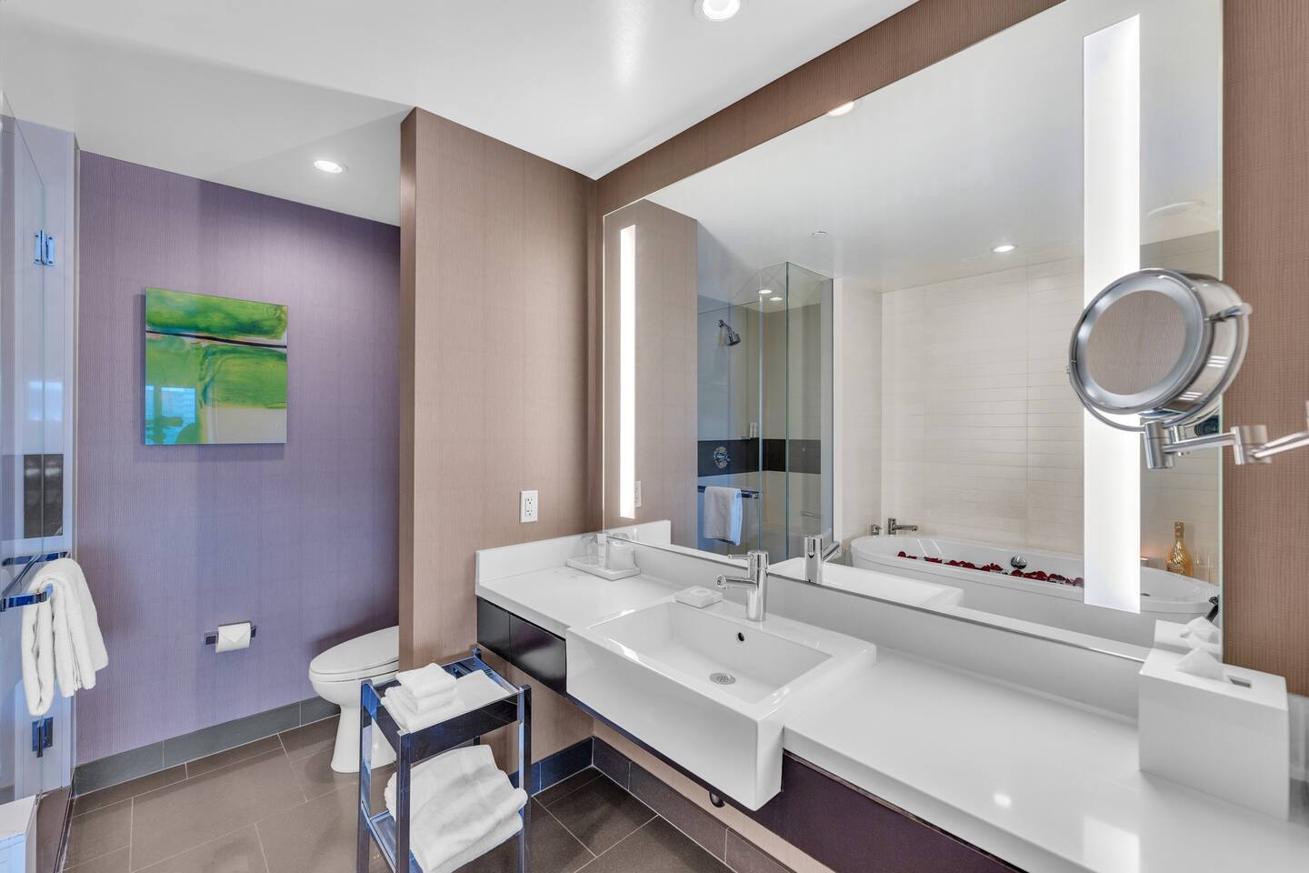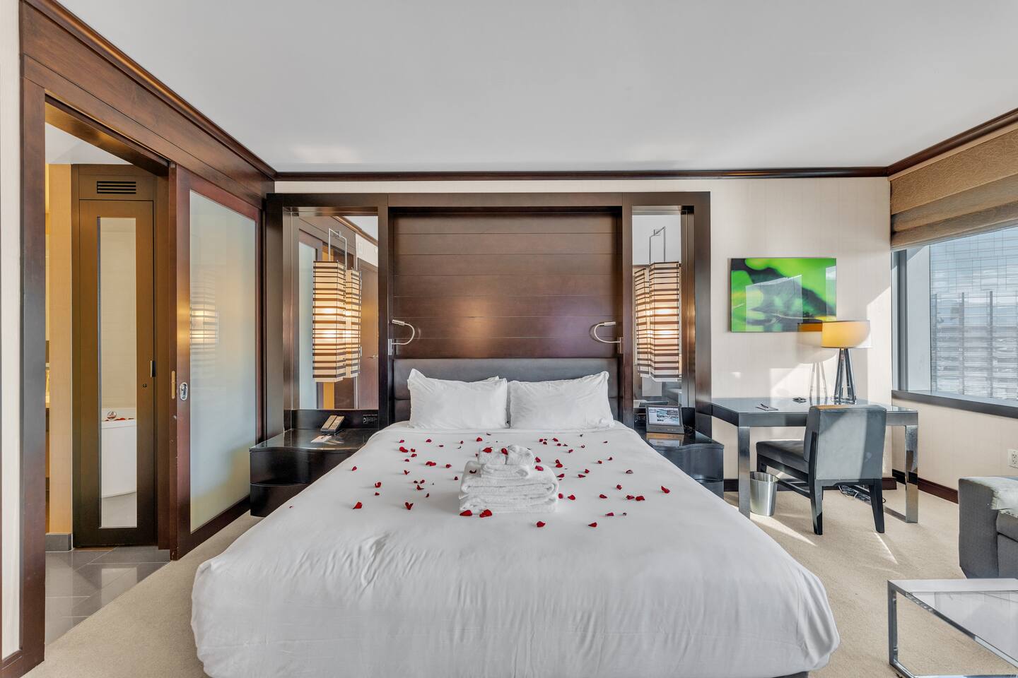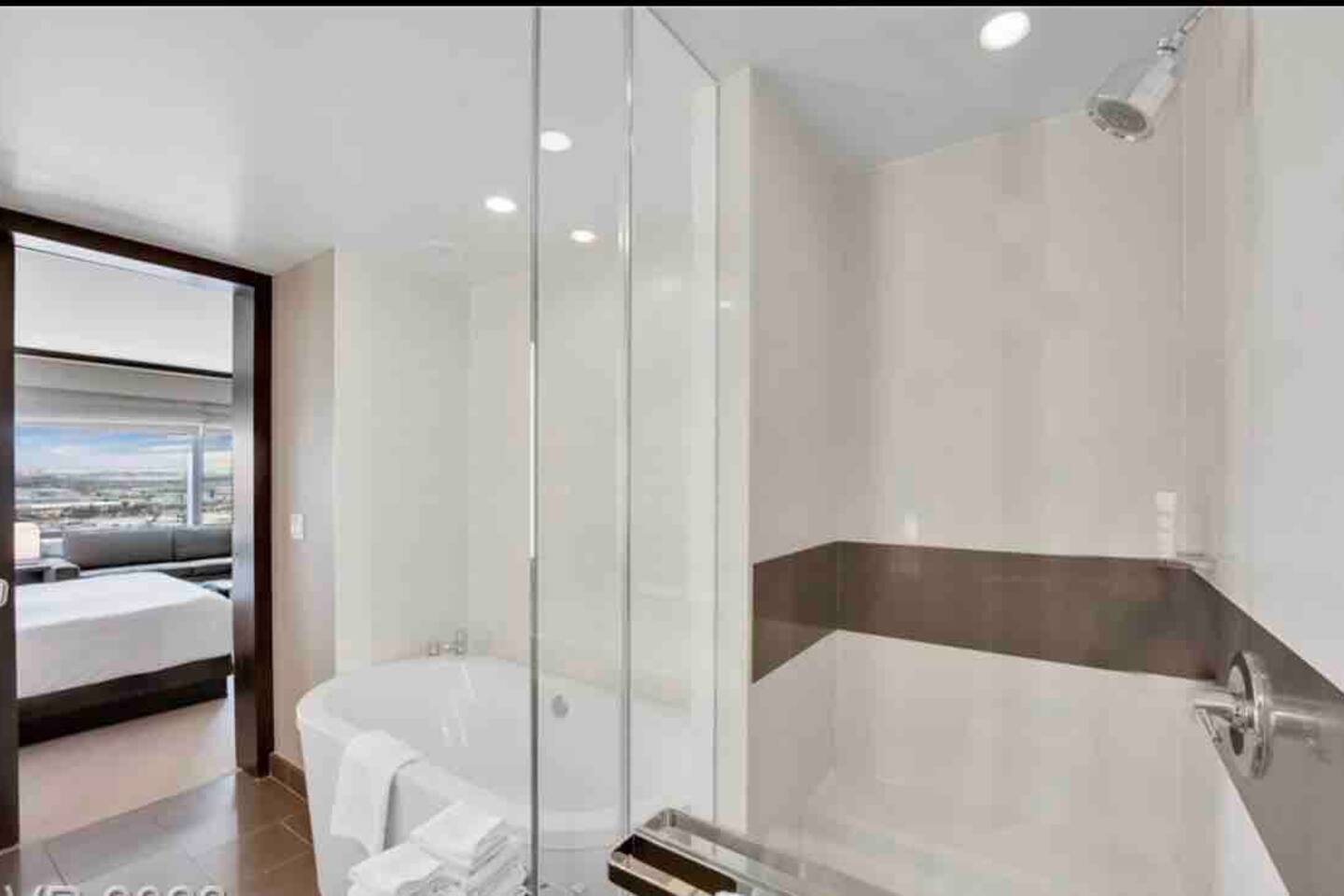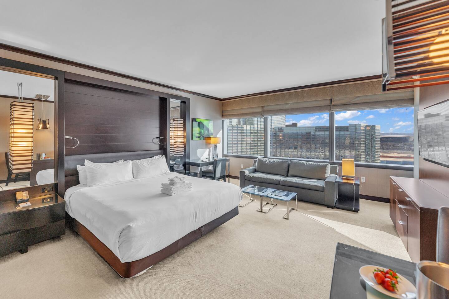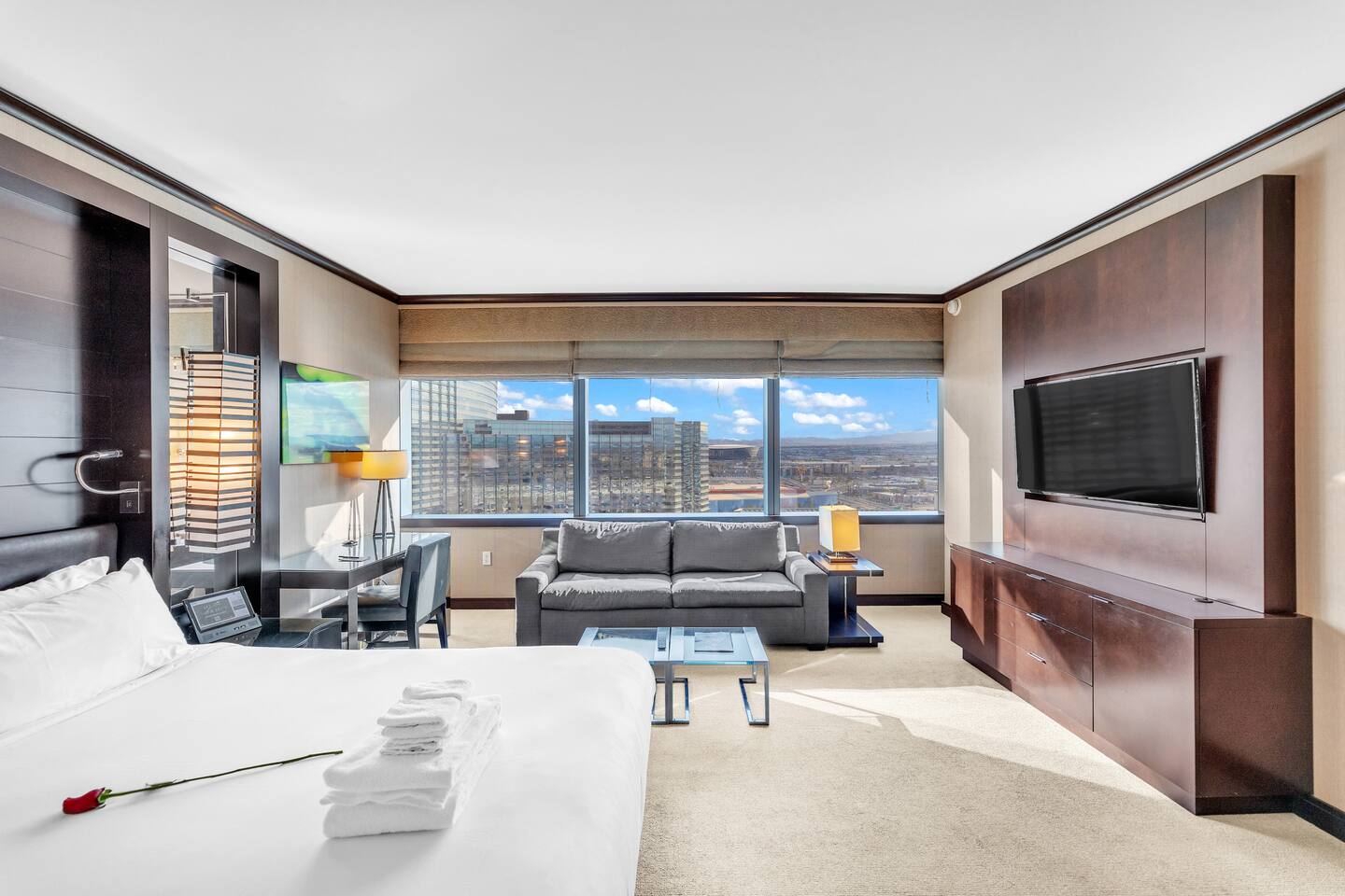 What happens in Vegas stays in Vegas! This suite is a studio with King bed with pillow-top mattress. It offers the following features: • A kitchenette fully equipped with a 2 electric stove burners, microwave, sink, and a mini fridge. • Living room with pullout queen-size sofa bed • Walk in shower & spa-style soaking tub • In-suite tablet to order in-suite dining, request spa and salon appointments, • View digital guest service directory and more • 50" Digital LCD flat-screen TV • Dining table for two • Workspace desk and chair *** Your name on your airbnb account must match your ID when checking in at the front desk ♥️ Book with confidence! We are a legally permitted Airbnb property with an active (1.) NV business license and (2.) Clark County vacation rental permit. Clark county Clark County Department of Fire and Prevention inspected and approved.