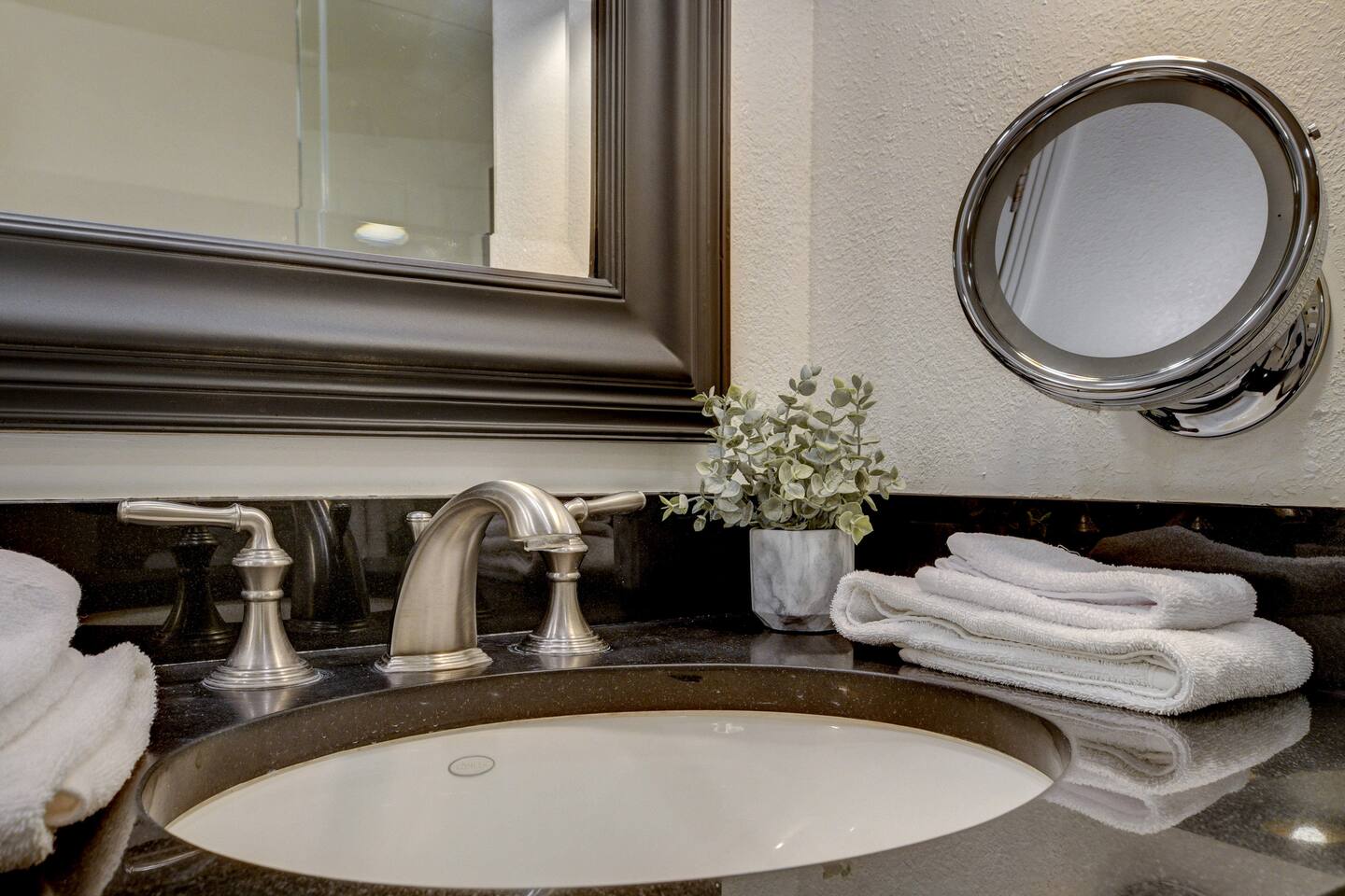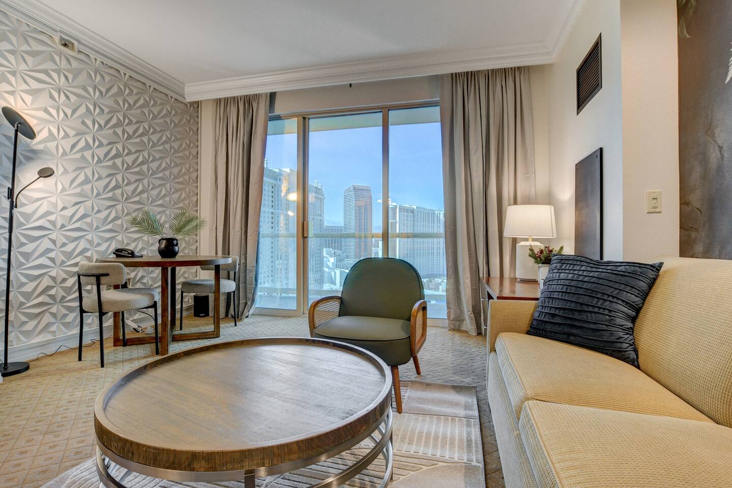 Welcome to our timeless and stunning high-rise condo in the heart of vibrant Las Vegas! Enjoy stunning panoramic views of the iconic Strip from your private balcony. Immerse yourself in modern comfort with sleek furnishings, a fully equipped kitchenette, and access to exclusive building amenities. Whether you're here for the nightlife or a relaxing getaway, this stylish oasis is your perfect home base. The highlight of this 550 sq foot deluxe unit is the private balcony, where you'll be treated to breathtaking views of the iconic Las Vegas Strip. Picture yourself sipping your morning coffee or enjoying a glass of wine as the city lights up at night. Inside, you'll find a well-appointed kitchenette, perfect for whipping up a quick meal or snack. The separate shower and indulgent jetted tub provide a spa-like experience, allowing you to unwind and relax after a day of exploring. You'll have easy access to world-class entertainment, dining, and shopping options. Whether you're here for a weekend getaway or an extended stay, this condo offers a comfortable retreat in the midst of all the excitement. Amenities include but not limited to: King size bed with a plush luxury mattress Queen size sofa bed in the living room Miele and Bosch fully stocked kitchenette Stainless steel mini fridge and microwave 2 electric burner stovetop Dining table Keurig coffee maker Starbucks k-cups and hot tea Dinnerware and utensils Digital safe Comfortable accent chair Workspace area Iron and Ironing board. Ultra-thin LCD flat-screen, high-definition TV High-speed Internet access with wireless capabilities. The bathroom features dual sinks, a walk in shower and oversized Jacuzzi-brand whirlpool tubs. Per MGM Signature policy, there are only four guests maximum in the studio suite. Book with confidence! We are a legally permitted Airbnb property with an active (1.) NV business license and (2.) Clark County vacation rental permit. Clark county Clark County Department of Fire and Prevention inspected and approved.