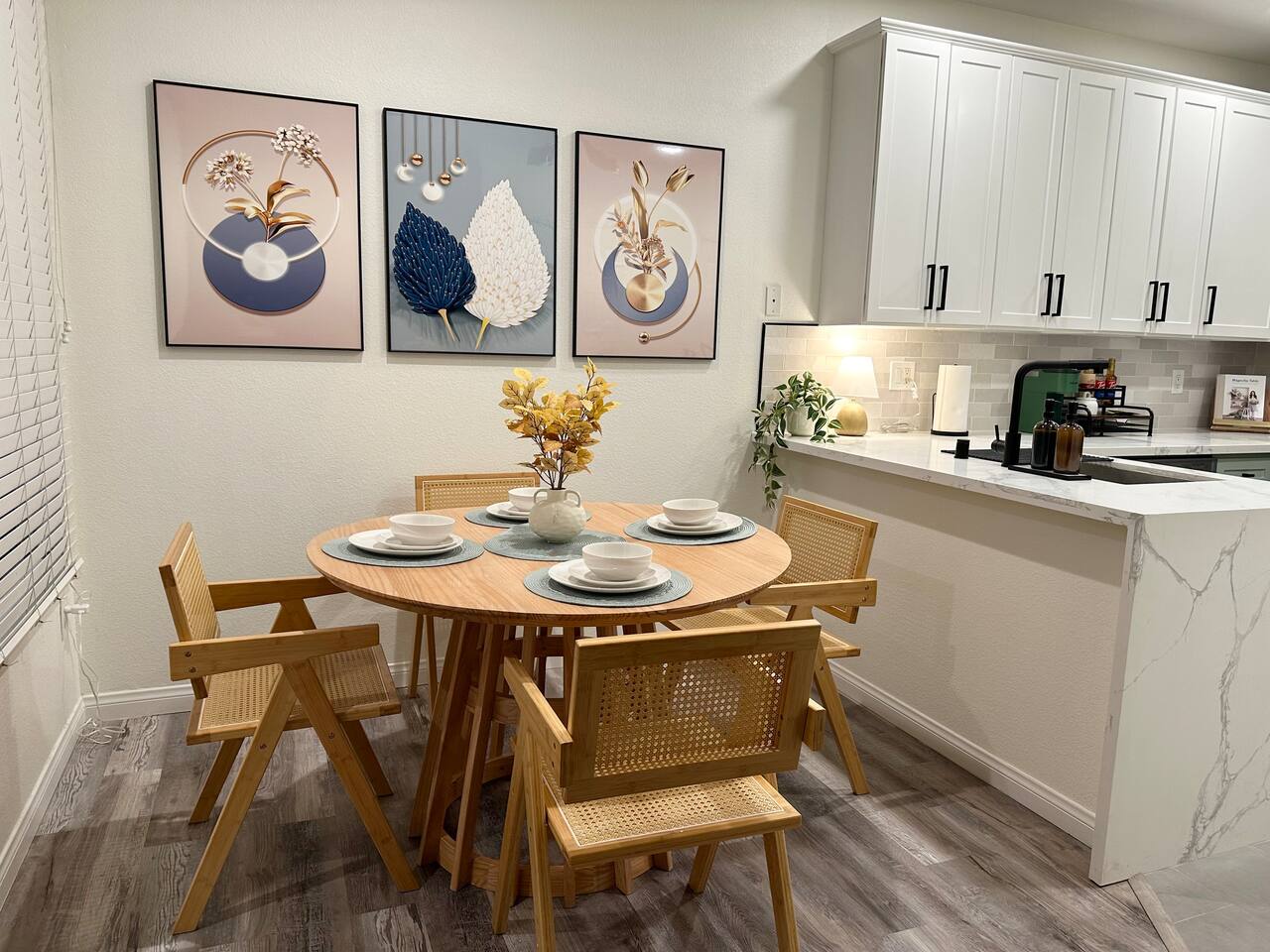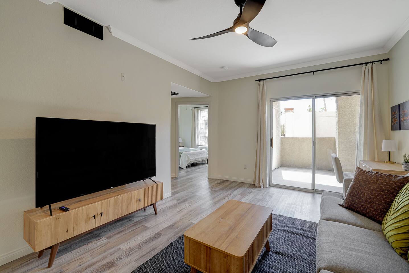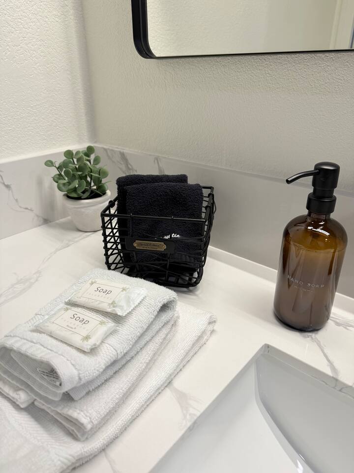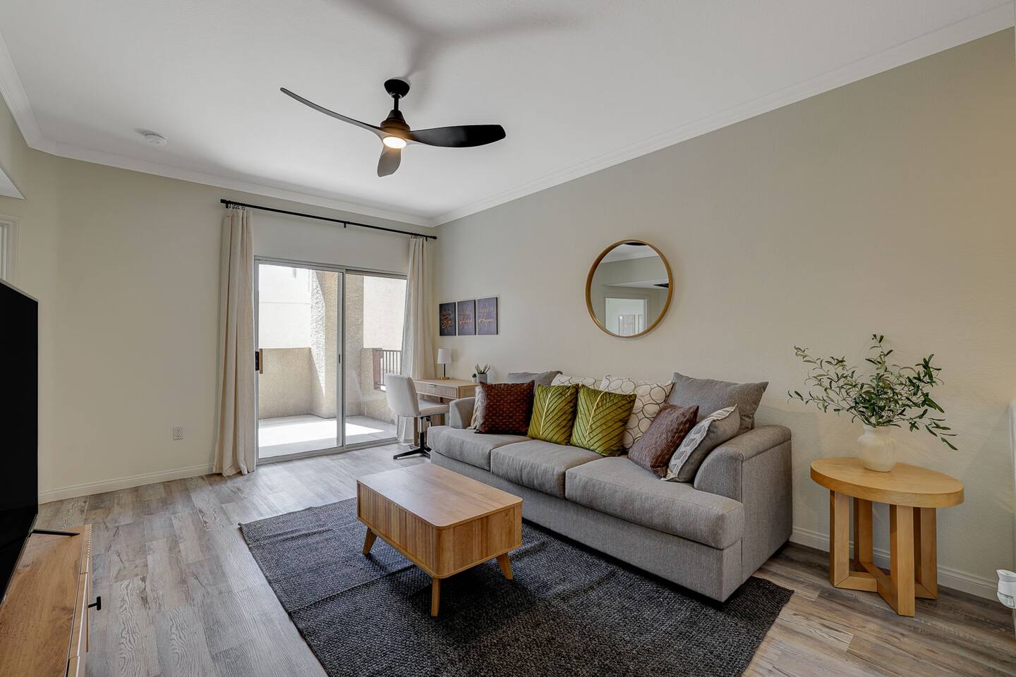 Step into the spacious living area, adorned with modern scandanavian design and tasteful decor. Relax on the plush sofa or enjoy a meal at the dining table, illuminated by natural light streaming through large windows. 👩🏻🍳The fully equipped kitchen features sleek quartz countertops and stainless steel appliances, ideal for preparing delicious meals during your stay. ✔️ Coffee machine ✔️ Toaster ✔️ Blender ✔️ Kettle ✔️ Pots and Pans ✔️ Dinnerware and Glassware The tranquil bedroom boasts a comfortable queen-size bed, ensuring a restful night's sleep after a day of exploring Las Vegas. 🛁🚿The adjacent bathroom is elegantly designed and equipped with modern light fixtures, newly renovated walk in shower, and luxury toiletries offering a spa-like experience. Sleeping area: 🛏️ Bedroom - 1 queen size bed 🛋️ Living room - 1 couch
