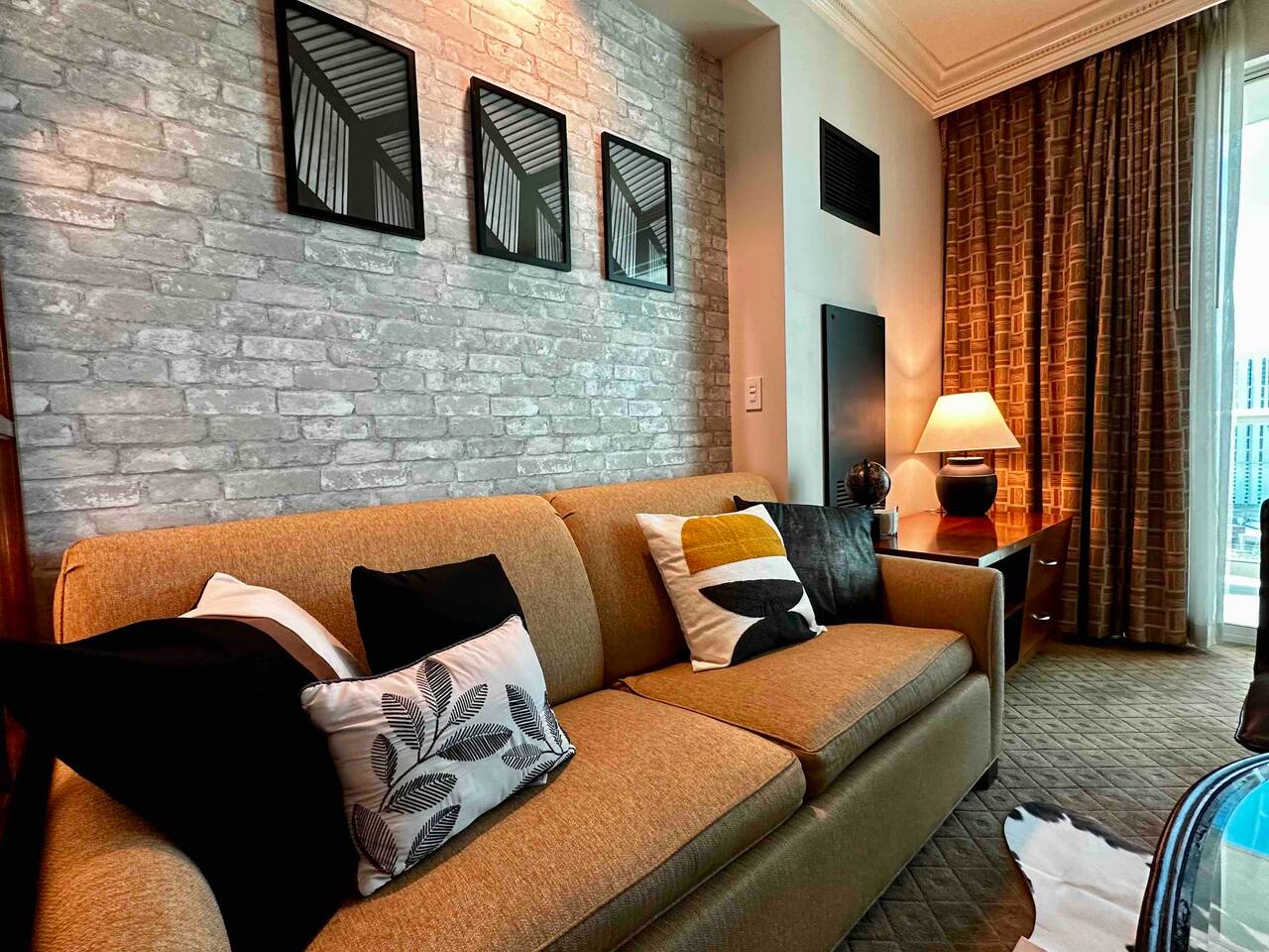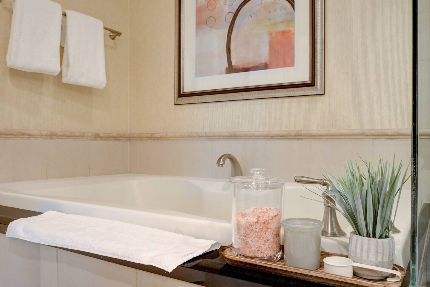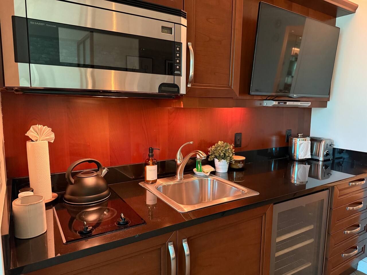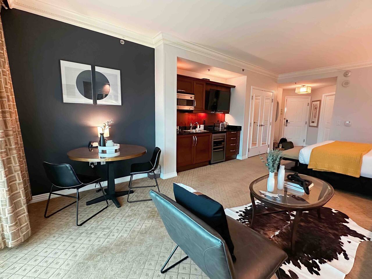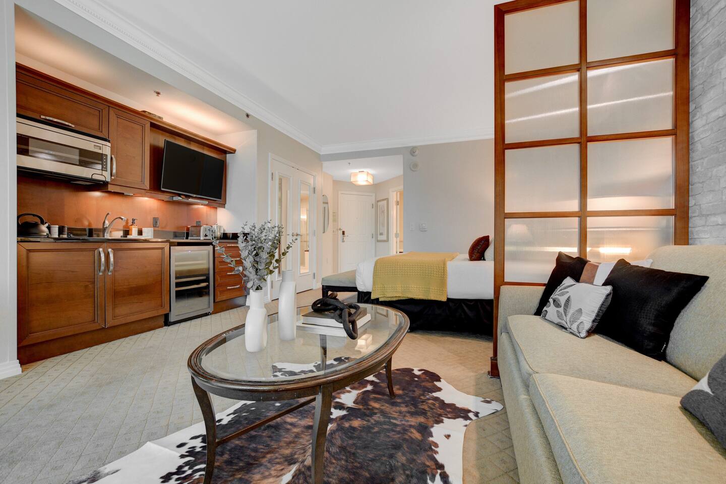 You are booking a unique studio suite that is beautifully furnished that's nothing like any other units within the MGM Signature. It features an edgy design yet still provides pure tranqility of 550 sq footage of living space that showcases heavy influence on contemporary palette with traces of industrial elements. A retreat displaying warmth, comfort and quiet escape. β¨ Amenities include but not limited to: 1 King size bed with a plush luxury mattress 1 Queen size sofa bed in the living room Miele and Bosch fully stocked kitchenette Stainless steel mini fridge and microwave 2 electric burner stovetop Dining table Keurig coffee maker Coffee k-cups and hot tea Dinnerware and utensils Digital safe Comfortable accent chair Workspace/Dining area seating for 2 Iron and Ironing board. Ultra-thin LCD flat-screen, high-definition TV High-speed Internet access with wireless capabilities. The bathroom features dual sinks, a walk in shower and oversized Jacuzzi-brand whirlpool tub. β₯οΈ Book with confidence! Licensed and inspected vacation rental.